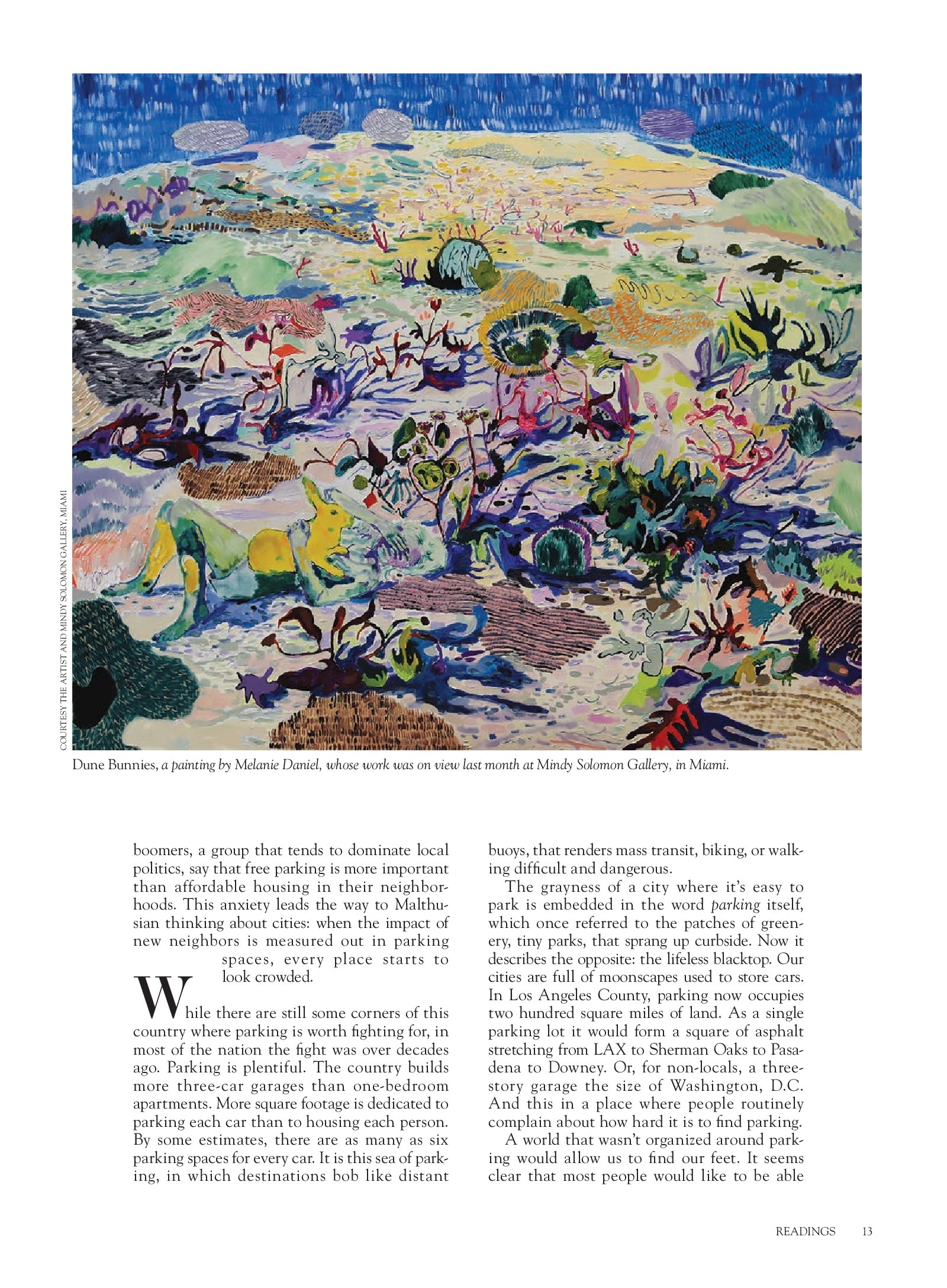 In Melanie Daniel’s psychedelic, richly-textured landscapes, figures inhabit otherworldly ecosystems in which nature runs riot. Her unnatural palette, dense areas of vibrating pattern, and skewed perspectives underscore the uneasy relationship between the subjects and their environment. The human presence overwhelmed by the natural world is reminiscent of Jules de Balincourt, Hernan Bas, or Lisa Yuskavage. Daniel’s big, brash, and strangely beautiful works are cautionary yet hopeful. They show the resilience of nature, as plants and flowers intermingle with graffitied ruins and threaten to overrun the canvas.