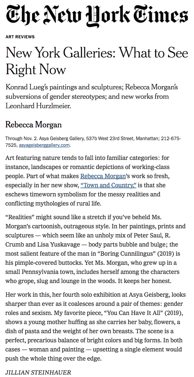 “Realities” might sound like a stretch if you’ve beheld Ms. Morgan’s cartoonish, outrageous style. In her paintings, prints and sculptures — which seem like an unholy mix of Peter Saul, R. Crumb and Lisa Yuskavage — body parts bubble and bulge; the most salient feature of the man in “Boring Cunnilingus” (2019) is his pimple-covered buttocks. Yet Ms. Morgan, who grew up in a small Pennsylvania town, includes herself among the characters who grope, slug and lounge in the woods. It keeps her honest.